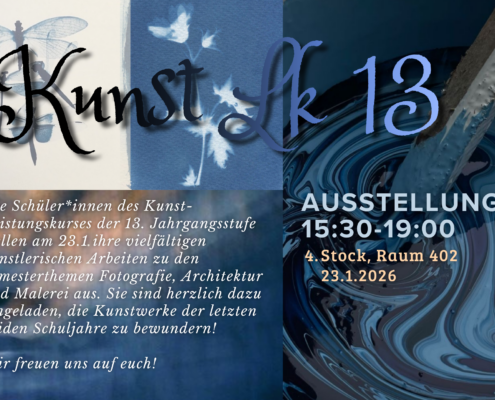Die Schüler*innen des Kunst-Leistungskurses der 13. Jahrgangsstufe stellen 23.01. ihre vielfältigen künstlerischen Arbeiten zu den Semesterthemen Fotografie, Architektur und Malerei aus.