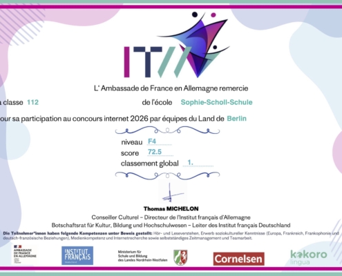 Am 24.02. hatten die Schülerinnen und Schüler der SESB-Klassen (111, 112, LK 12 und LK 13) die große Ehre, in die Französische Botschaft eingeladen zu werden, um an der Präsentation des Buches „63 Orte der deutsch-französischen Geschichte“…