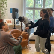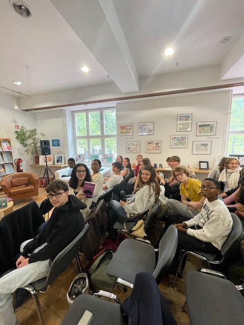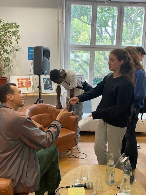 Am Freitag, den 26. September, hatte die Französischklasse der 10. Jahrgangsstufe von Mme Rivoire die große Ehre und Freude, den Autor Gaël Faye zu treffen, der in Berlin war, um die deutsche Übersetzung seines neuesten Romans Jacaranda vorzustellen. Die Schüler*innen hatten sich im Unterricht mit dem Völkermord an den Tutsi in Ruanda beschäftigt und waren sehr angetan von den Auszügen aus Jacaranda, die sie gelesen hatten. Sie konnten den Autor persönlich treffen und stellten ihm in der vertrauten Atmosphäre der französischen Mediathek viele interessante Fragen. Es war für uns alle ein besonderes Privileg, die Weisheit dieses Autors genießen zu dürfen.