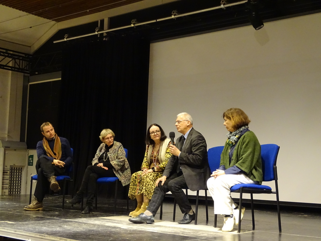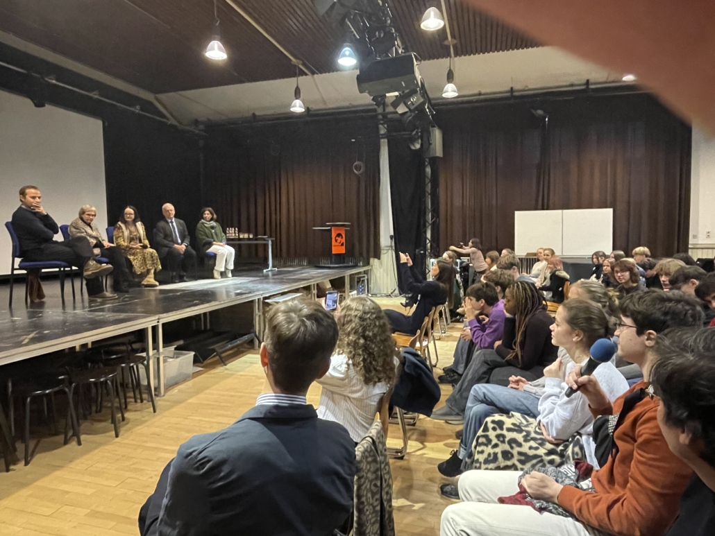 Nach der Rede von zwei Abibac-Schülerinnen, Emilie Hell und Coline Steinbach, und der Vorführung eines Ausschnitts aus Shoah konnten die Schülerinnen und Schüler der 10., 11., 12. und 13. Klassen der Sophie-Scholl und des Französischen Gymnasiums den Mitgliedern des Vereins „Claude et Félix Lanzmann“ Fragen stellen. Es war eine äußerst eindrucksvolle Begegnung für unsere Schülerinnen und Schüler und die Entdeckung eines außergewöhnlichen Films.