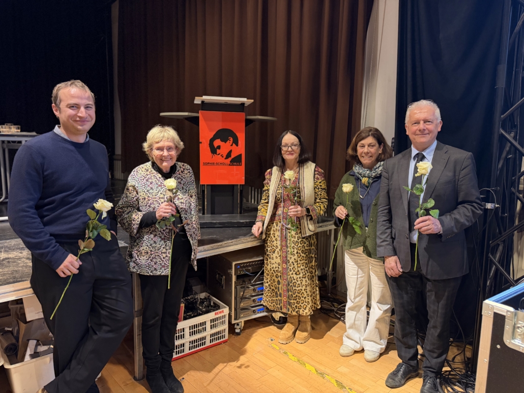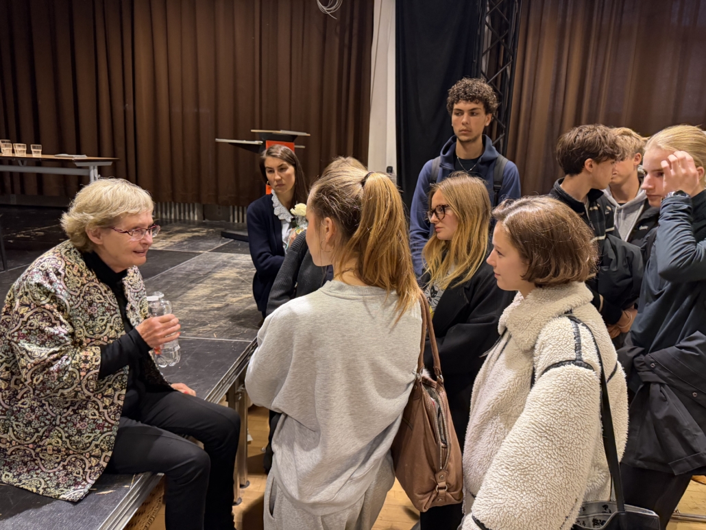 Zum 100. Geburtstag von Claude Lanzmann (1925–2018), dem herausragenden französischen Journalisten, Filmemacher und Chronist der Shoah, hatten wir am Freitag, den 28. November 2025, die große Ehre, Frau Lanzmann, Frau Dr. Coulmas, Frau de la Vega, Herrn Dr. Sagnol und Herrn Delattre in der Sophie-Scholl-Schule begrüßen zu dürfen. Der weltberühmte Film Shoah ist sowohl ein Meilenstein in der Filmgeschichte als auch in der Ausarbeitung des Holocausts.